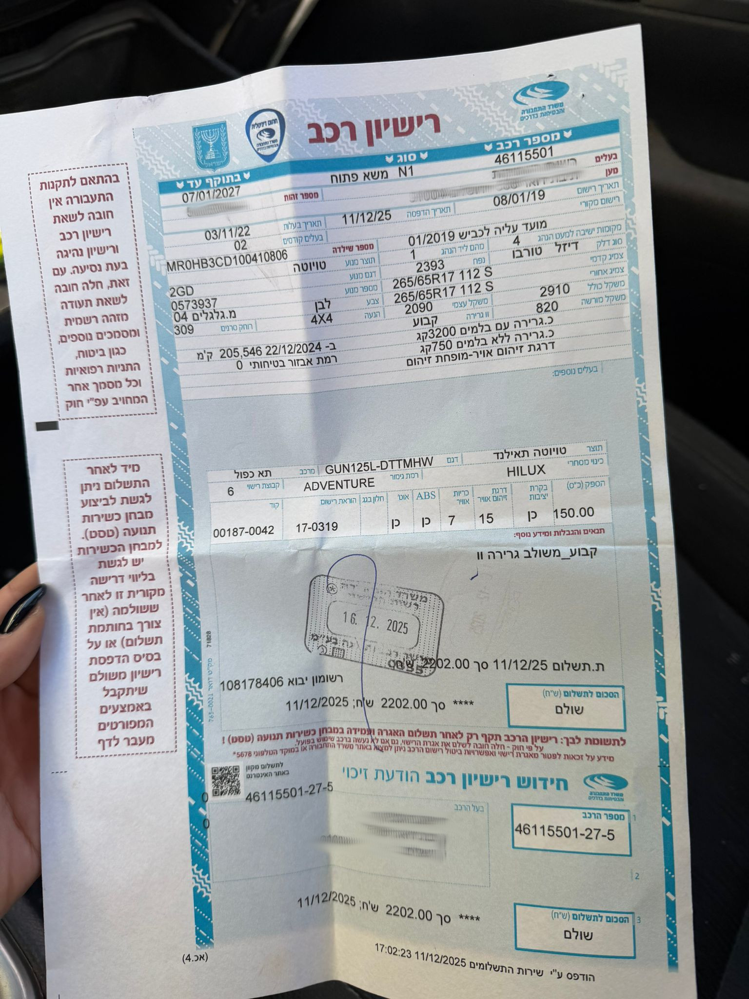 טויוטה היילקס ADVENTURE 4X4, 2019 המכירה תתחיל ב: 30/12/2025 בשעה 11:00